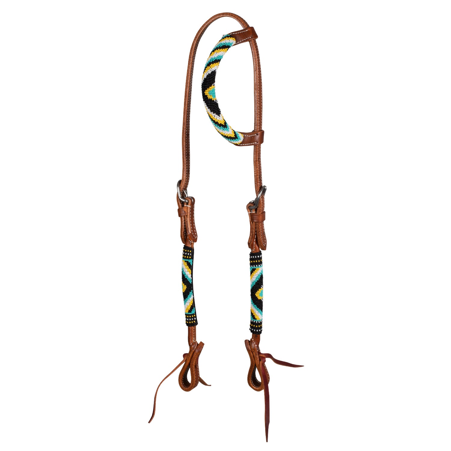High-quality leather western headstall with a single ear, super durable thanks to the stainless steel buckles and multicolored bead decorations.